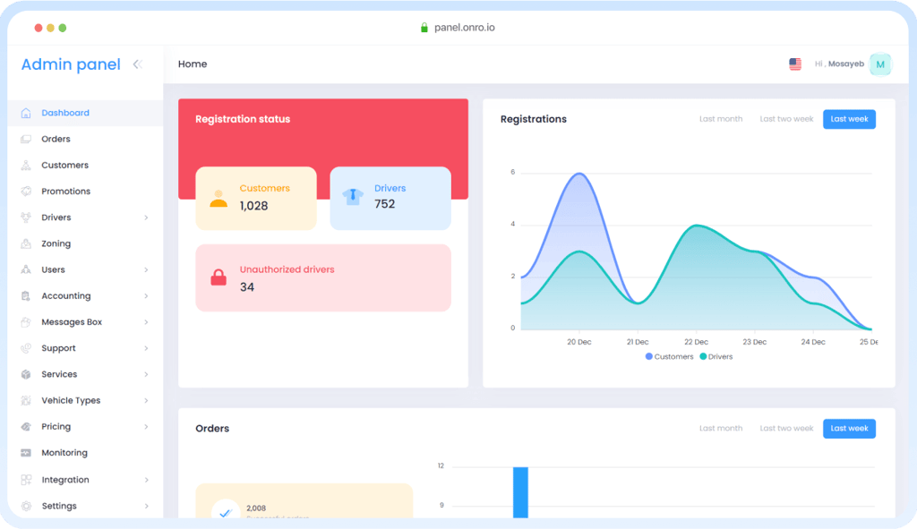 لوحة معلومات كاملة لإدارة السائقين والطلبات والعروض الترويجية والتحقق من التحليلات والتقارير.